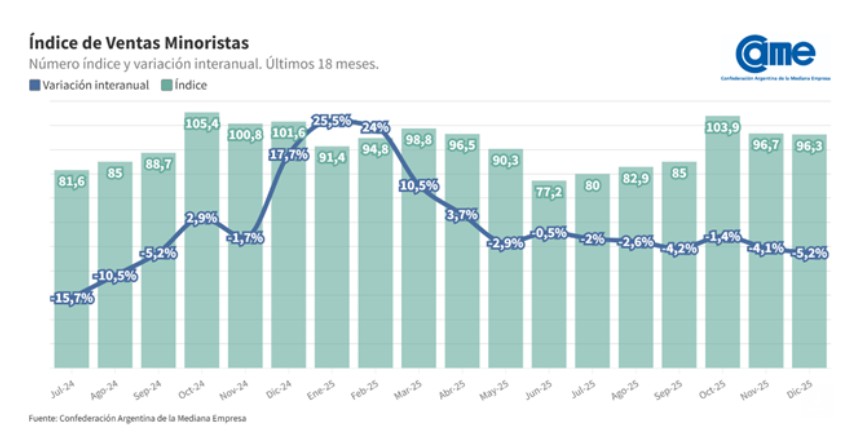 A precios constantes, el comercio minorista pyme registró en diciembre una caída interanual del 5,2%, con retrocesos en casi todos los rubros. El consumo siguió restringido y concentrado en gastos esenciales, pese al impulso estacional de fin de año.