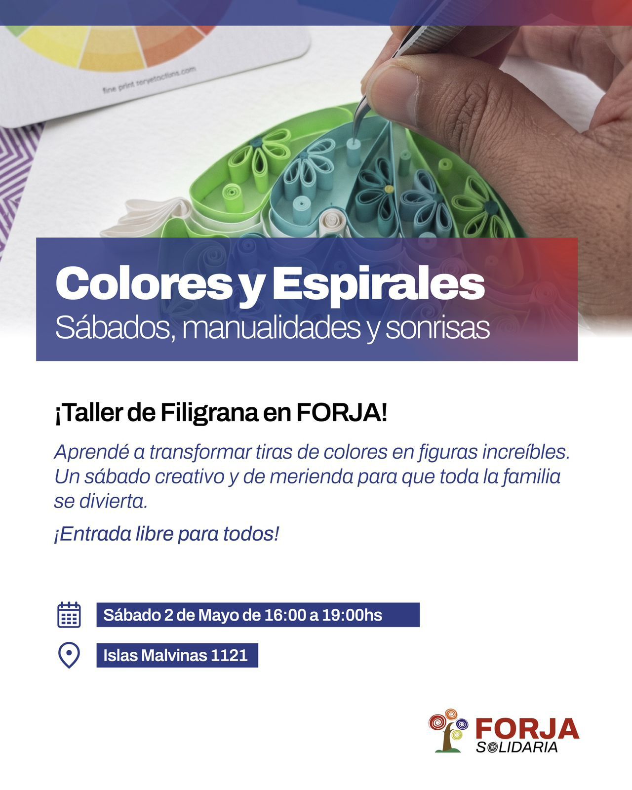 La propuesta se realizará este sábado 2 de mayo en la sede de FORJA, con una jornada pensada para compartir en familia, aprender la técnica de quilling y disfrutar de una merienda.